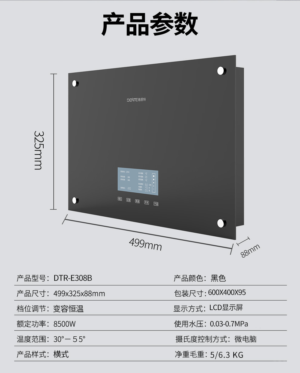 產品中心 > 即熱電熱水器系列> ——德恩特DTR-E308B 家用恒溫淋浴熱水器